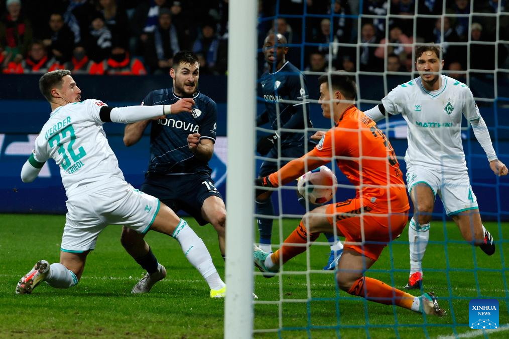 Michael Zetterer (2nd L), goalkeeper of SV Werder Bremen, tries to save the ball during the Bundesliga match between VfL Bochum and SV Werder Bremen in Bochum, Germany, Jan. 14, 2024. (Photo by Joachim Bywaletz/Xinhua)