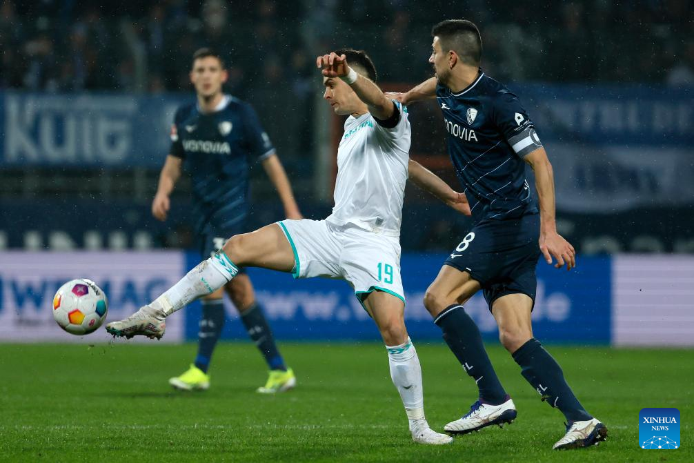 Matus Bero (2nd L) of VfL Bochum shoots during the Bundesliga match between VfL Bochum and SV Werder Bremen in Bochum, Germany, Jan. 14, 2024. (Photo by Joachim Bywaletz/Xinhua)