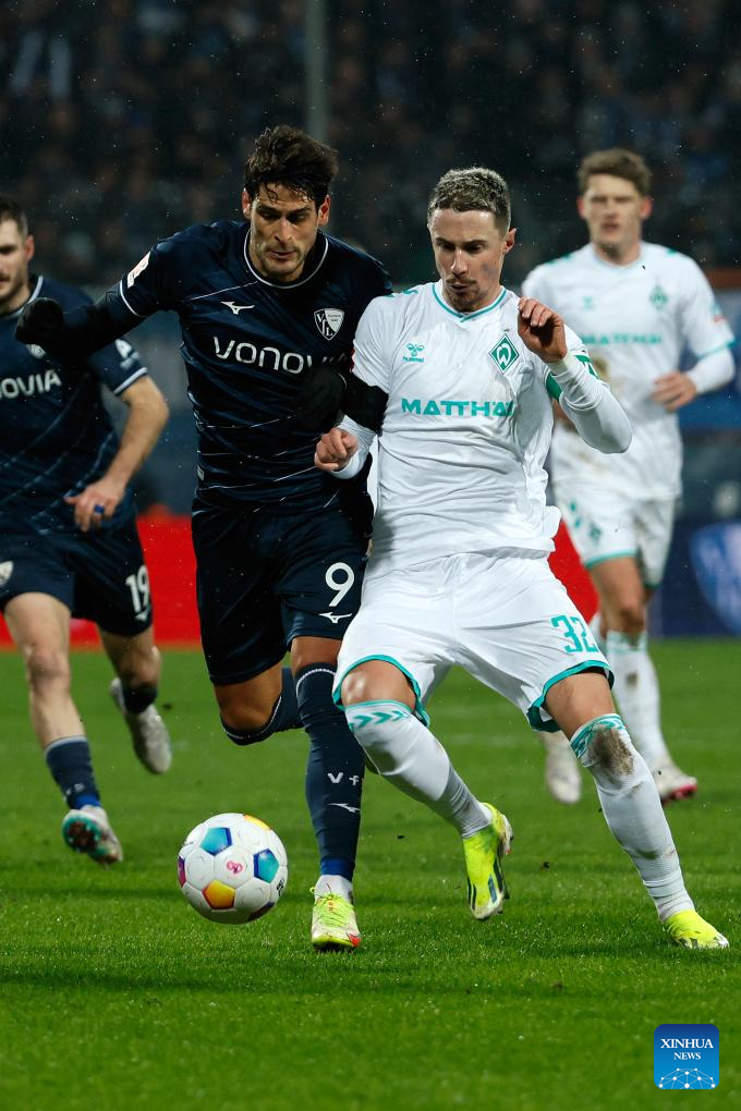 Anthony Losilla (R) of VfL Bochum vies with Rafael Santos Borre of SV Werder Bremen during the Bundesliga match in Bochum, Germany, Jan. 14, 2024. (Photo by Joachim Bywaletz/Xinhua)