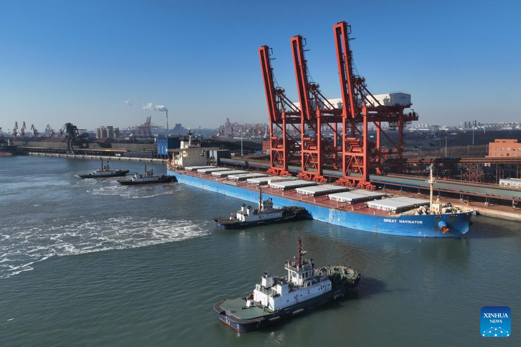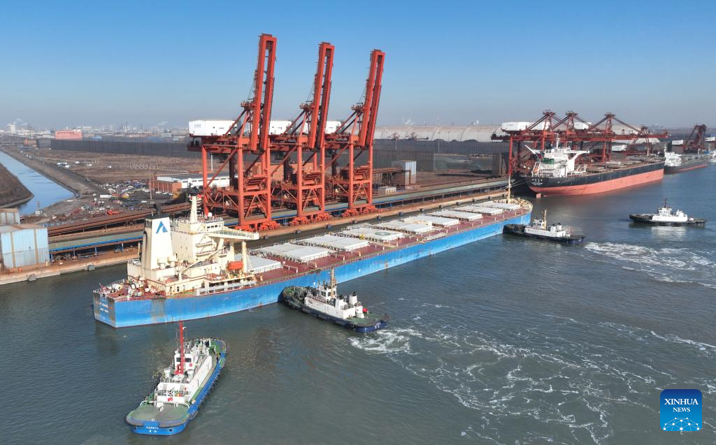 An aerial drone photo taken on Jan. 15, 2024 shows a ship being towed towards a coal terminal of Tangshan Port in north China's Hebei Province. In 2023, the cargo throughput at Tangshan Port surpassed 842.17 million tonnes, up 9.53 percent year on year, according to port authorities. (Xinhua/Yang Shiyao)