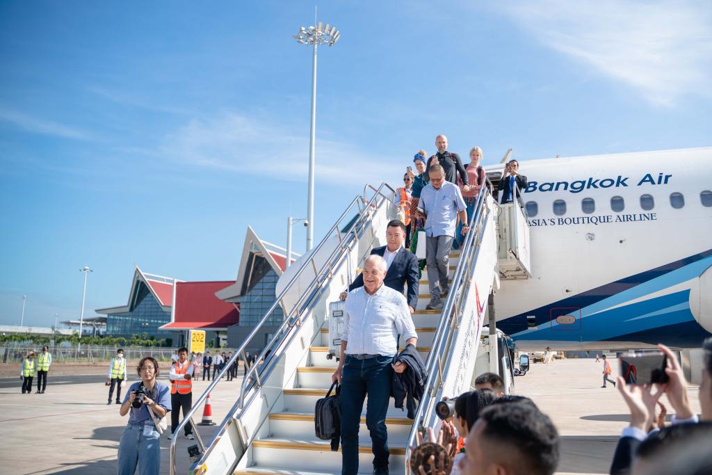 Passengers disembark from a plane at the Chinese-invested Siem Reap Angkor International Airport (SAI) in Siem Reap province, Cambodia on Oct. 16, 2023. (Photo by Sao Khuth/Xinhua)
