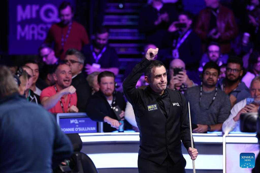 Ronnie O'Sullivan of England celebrates after the final match between Ronnie O'Sullivan and Ali Carter of England at Snooker Masters 2024 in London, Britain, Jan. 14, 2024. (Photo by Zhai Zheng/Xinhua)