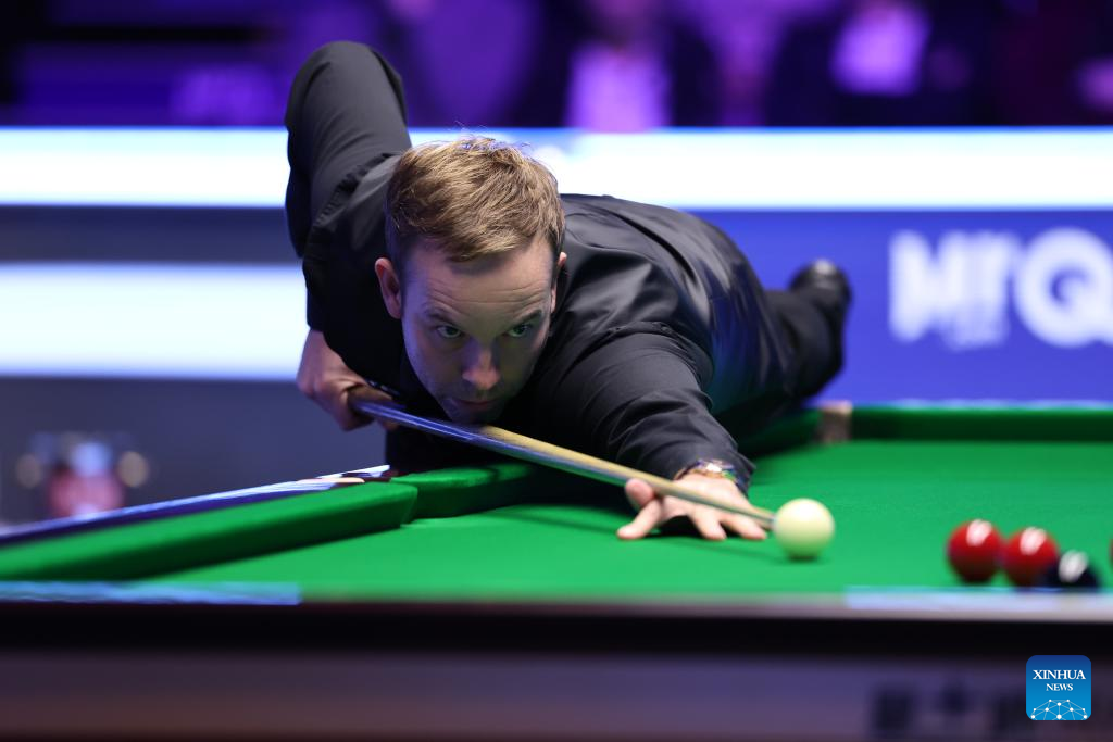 Ali Carter of England competes during the final match between Ronnie O'Sullivan and Ali Carter of England at Snooker Masters 2024 in London, Britain, Jan. 14, 2024. (Photo by Zhai Zheng/Xinhua)