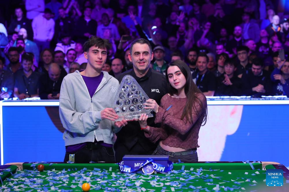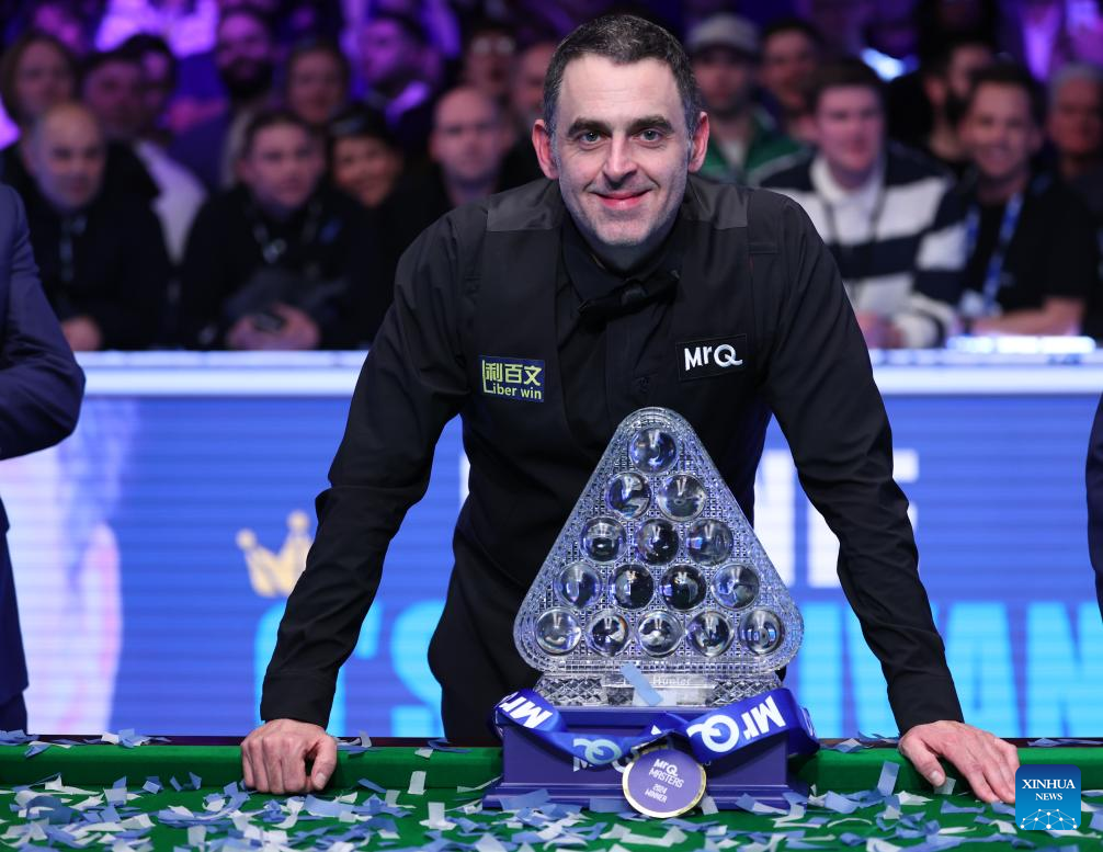 Ronnie O'Sullivan of England poses for photos with the trophy after the final match between Ronnie O'Sullivan and Ali Carter of England at Snooker Masters 2024 in London, Britain, Jan. 14, 2024. (Photo by Zhai Zheng/Xinhua)
