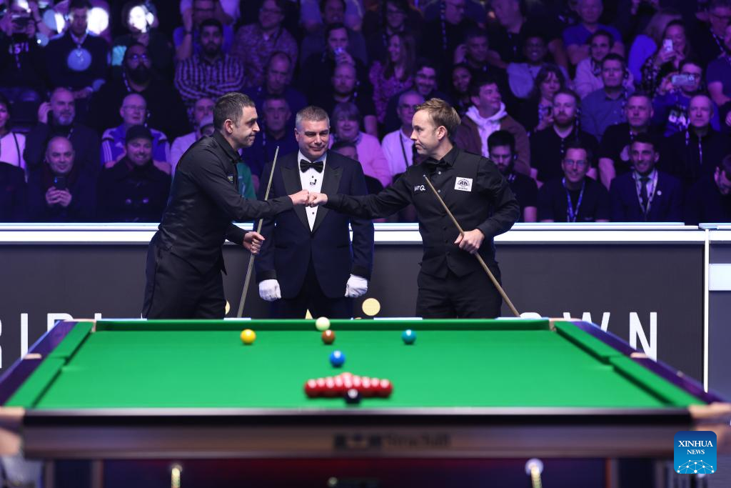Ronnie O'Sullivan (L) of England greets Ali Carter ahead of the final match between Ronnie O'Sullivan and Ali Carter of England at Snooker Masters 2024 in London, Britain, Jan. 14, 2024. (Photo by Zhai Zheng/Xinhua)