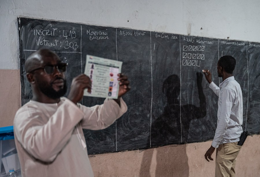 Election officials count votes at a polling station in Mitsudje, Comoros, Jan. 14, 2024. (Xinhua/Wang Guansen)