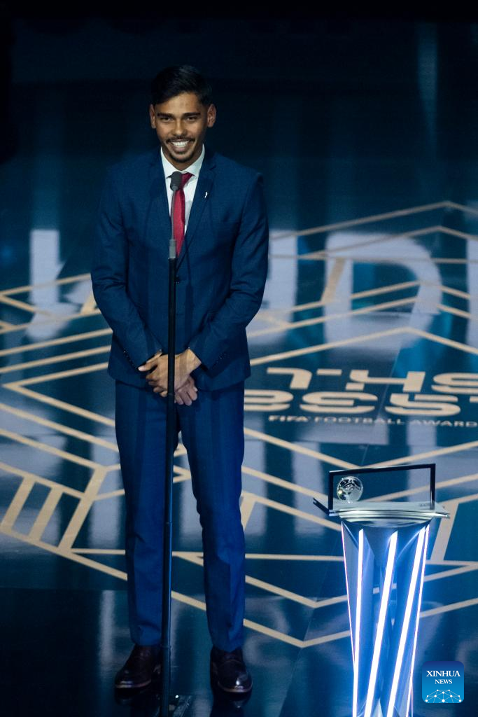 Guilherme Madruga of Brazil wins the FIFA Puskas Award (best goal) during the Best FIFA Football Awards 2023 in London, Britain, Jan. 15, 2024. (Photo by Stephen Chung/Xinhua)