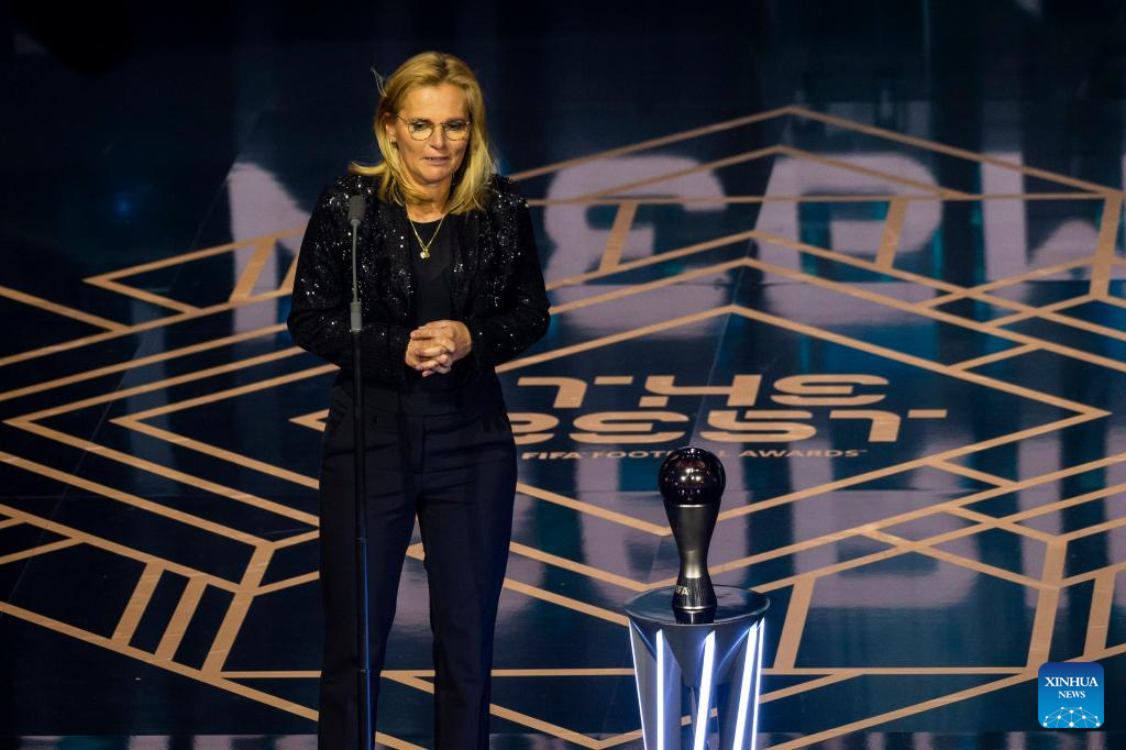 Sarina Wiegman, coach of England Women's National Team, wins women's best coach award during the Best FIFA Football Awards 2023 in London, Britain, Jan. 15, 2024. (Photo by Stephen Chung/Xinhua)