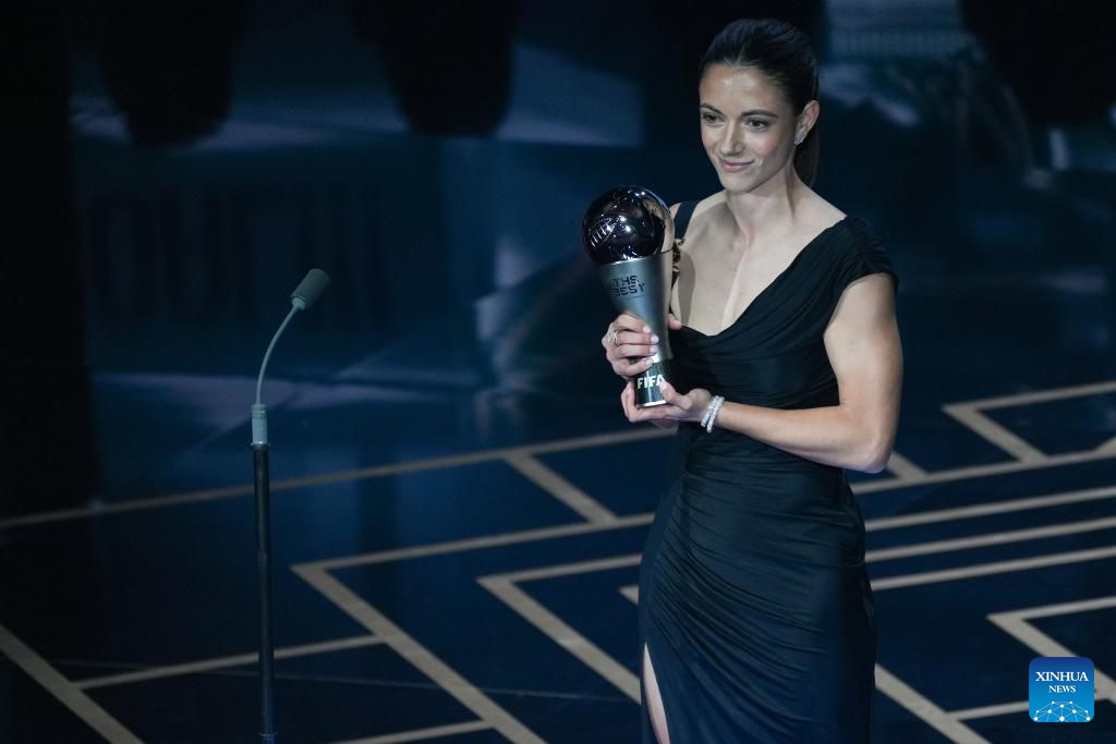 Spain and Barcelona midfielder Aitana Bonmati receives women's best player award during the Best FIFA Football Awards 2023 in London, Britain, Jan. 15, 2024. (Xinhua/Zhou Nan)