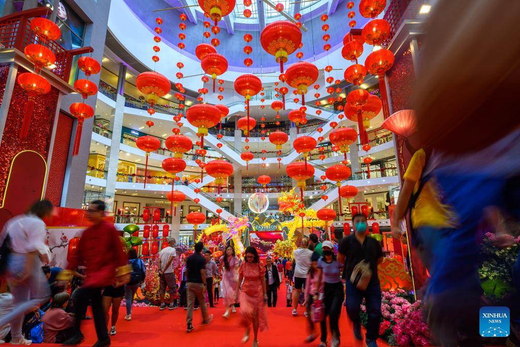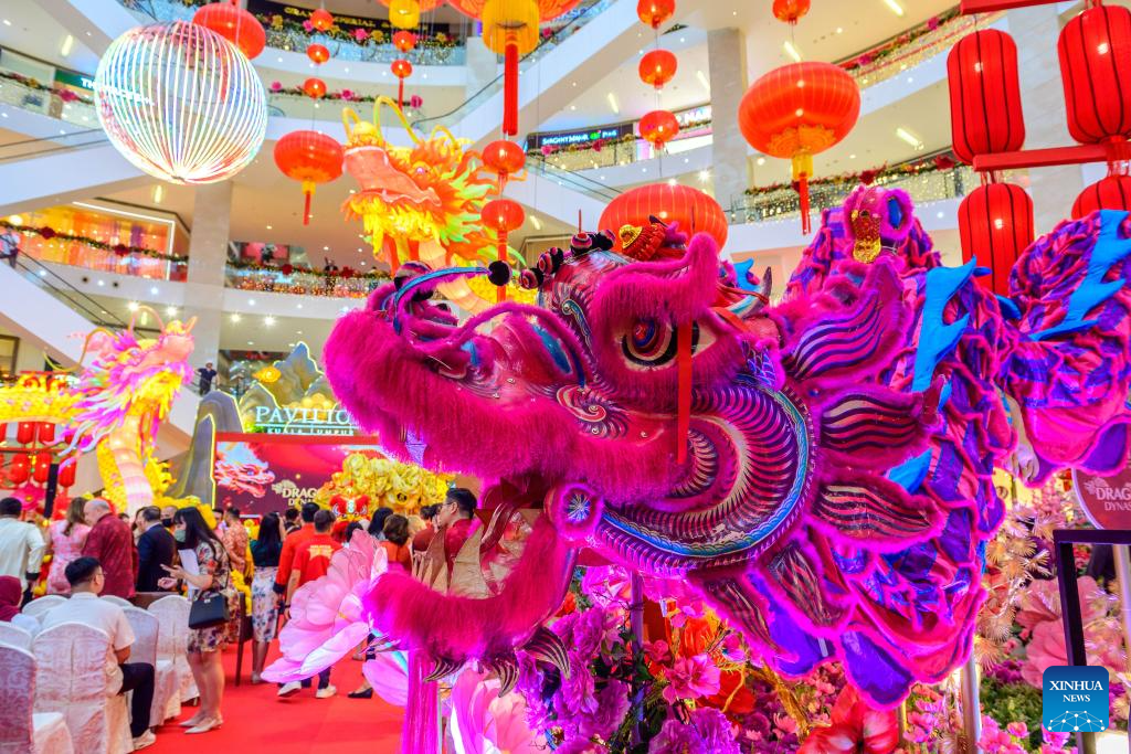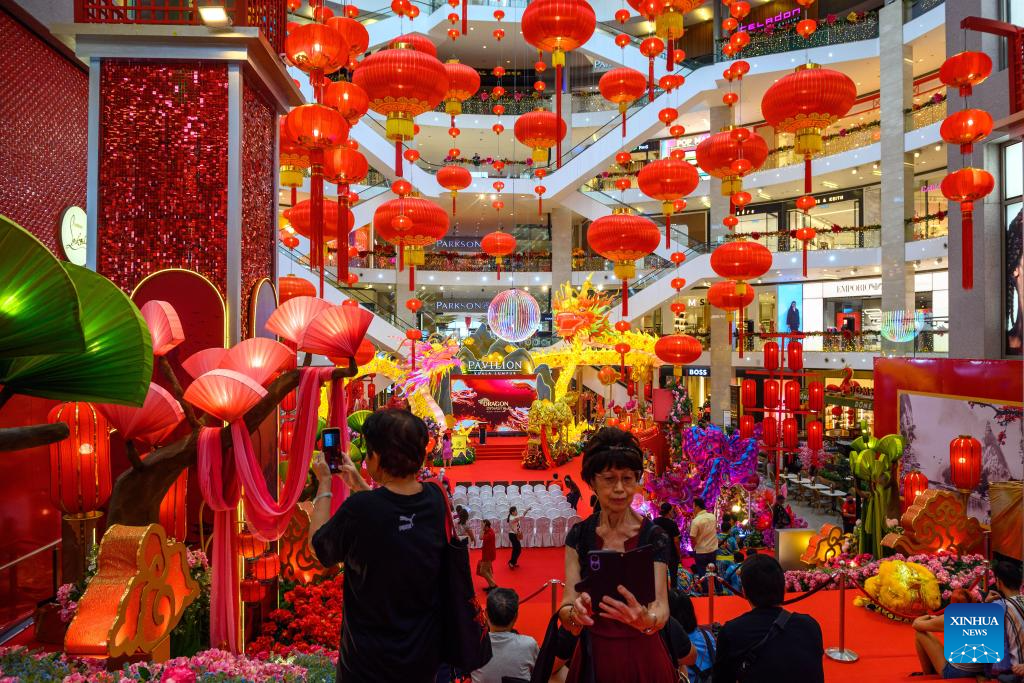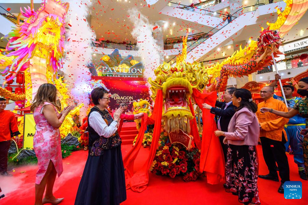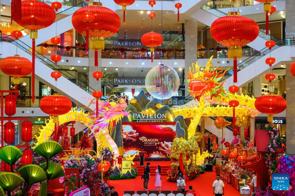People visit a shopping mall decorated with light installations in celebration of the upcoming Chinese zodiac Year of the Dragon in Kuala Lumpur, Malaysia, Jan. 16, 2024. (Photo by Chong Voon Chung/Xinhua)