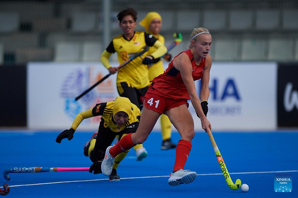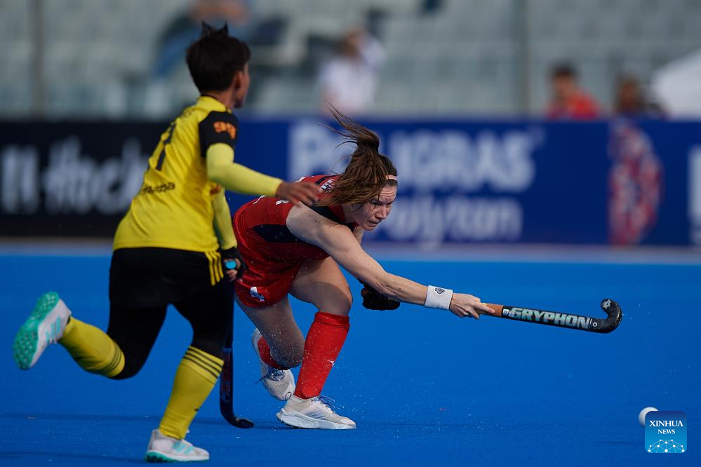 Laura Roper (R) of Britain vies with Nor Azhar of Malaysia during the Women's Hockey Olympic qualifier 2024 match between Britain and Malaysia in Valencia, Spain, on Jan.16, 2024. (Photo by Pablo Morano/Xinhua)