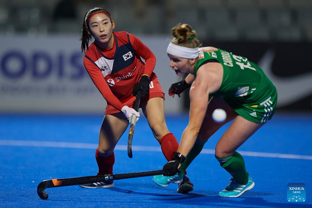 Kim Eunji (L) of South Korea with Naomi Carroll of Ireland during the Women's Hockey Olympic qualifier 2024 match between South Korea and Ireland in Valencia, Spain, on Jan.16, 2024. (Photo by Pablo Morano/Xinhua)