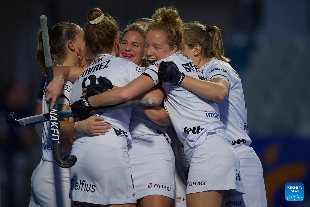 Players of Belgium celebrate the victory after the Women's Hockey Olympic qualifier 2024 match between Belgium and Ukraine in Valencia, Spain, on Jan.16, 2024. (Photo by Pablo Morano/Xinhua)