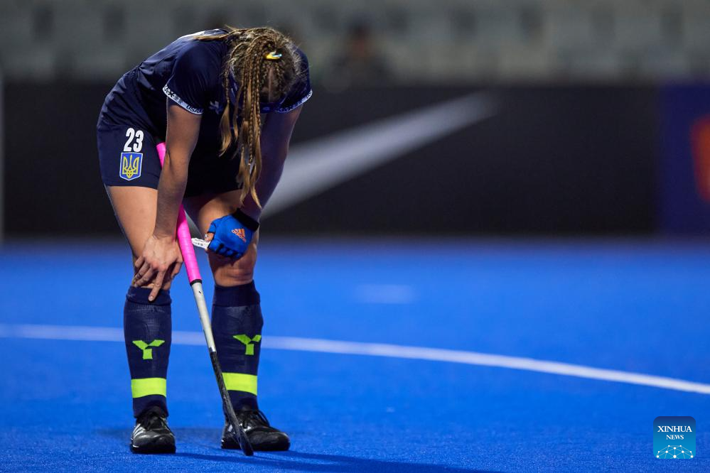 Kateryna Popova of Ukraine looks down after the Women's Hockey Olympic qualifier 2024 match between Belgium and Ukraine in Valencia, Spain, on Jan.16, 2024. (Photo by Pablo Morano/Xinhua)