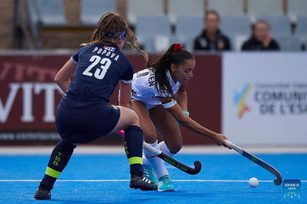 Ambre Ballenghien (R) of Belgium with Kateryna Popova of Ukraine during the Women's Hockey Olympic qualifier 2024 match between Belgium and Ukraine in Valencia, Spain, on Jan.16, 2024. (Photo by Pablo Morano/Xinhua)