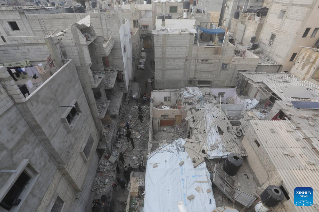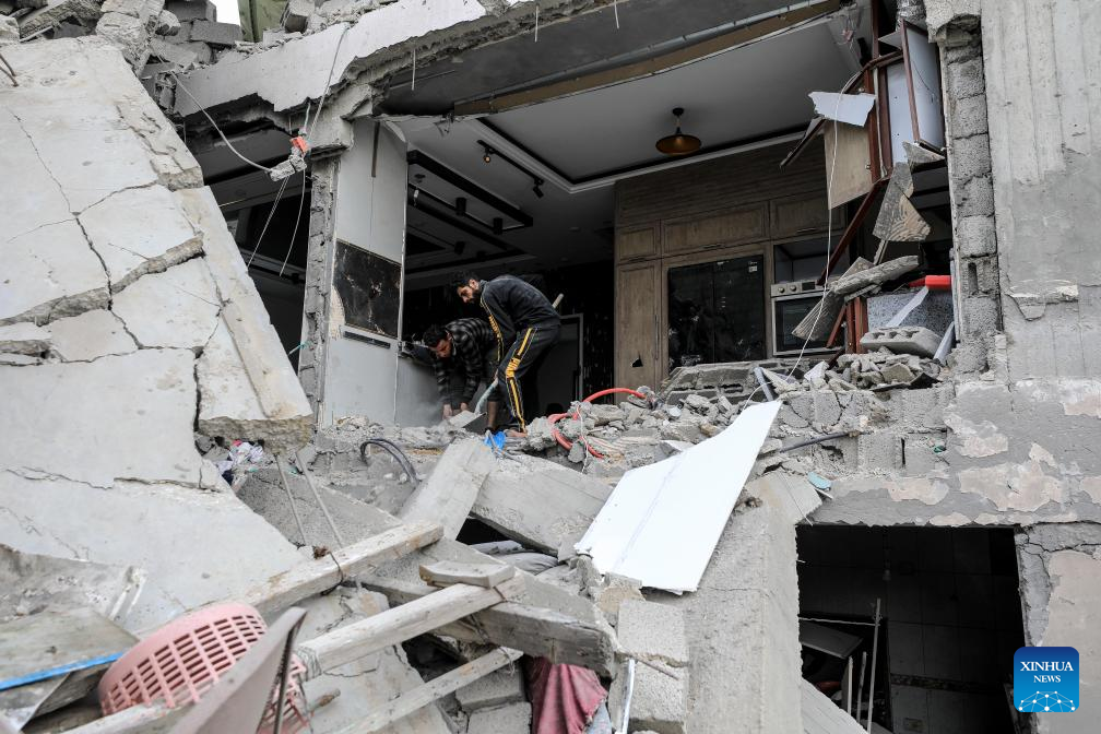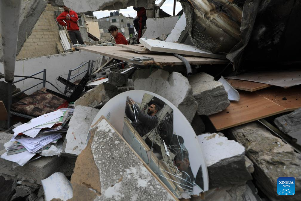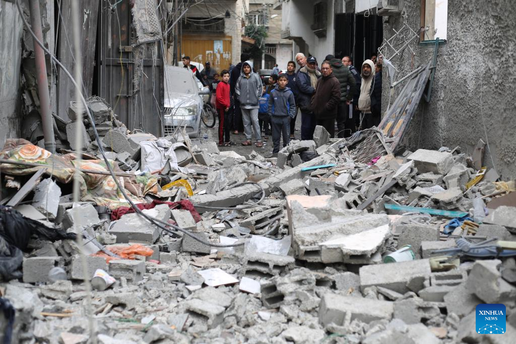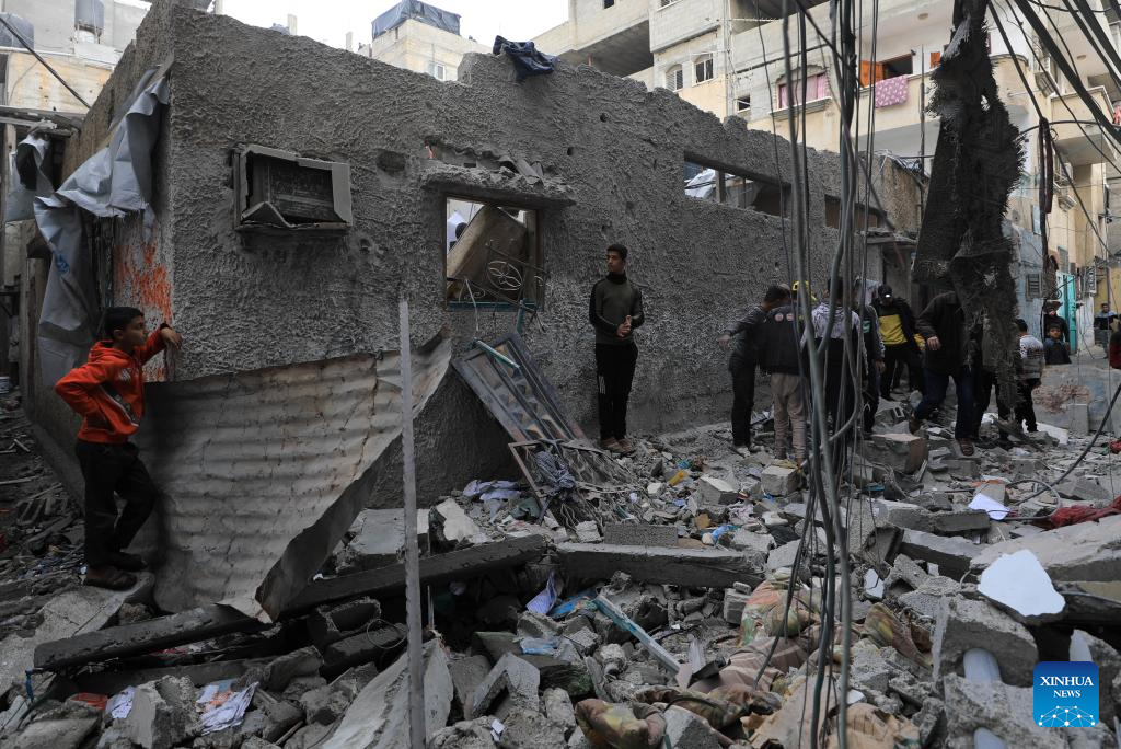 People inspect the damage after an Israeli airstrike in the southern Gaza Strip city of Rafah, on Jan. 17, 2024. In a statement on Wednesday, the Gaza-based health ministry said 163 Palestinians across the Gaza Strip were killed and 350 others were injured by Israeli fire in the past 24 hours. This brings the Palestinian death toll from ongoing Israeli attacks on the Strip to 24,448 and the number of injured to 61,504. (Photo by Khaled Omar/Xinhua)