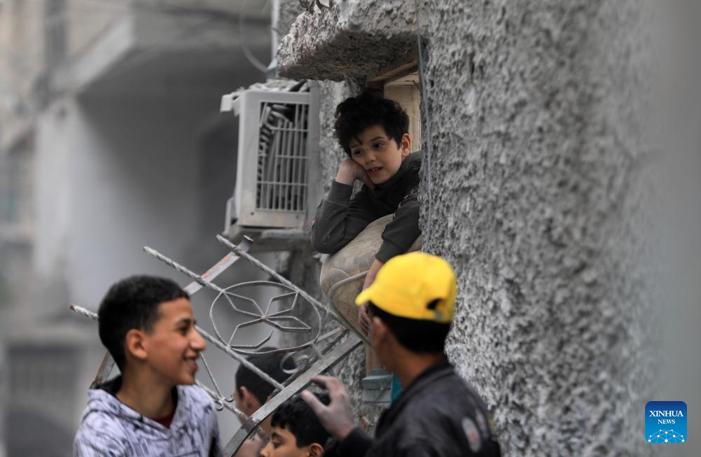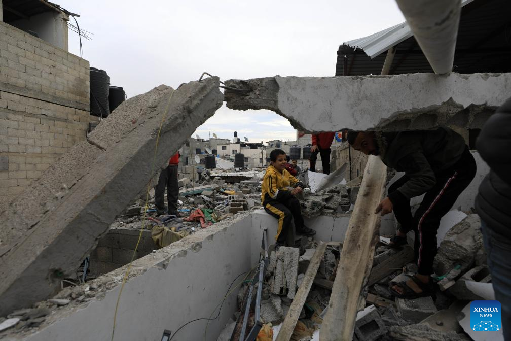 Children are seen around a destroyed building after an Israeli airstrike in the southern Gaza Strip city of Rafah, on Jan. 17, 2024. In a statement on Wednesday, the Gaza-based health ministry said 163 Palestinians across the Gaza Strip were killed and 350 others were injured by Israeli fire in the past 24 hours. This brings the Palestinian death toll from ongoing Israeli attacks on the Strip to 24,448 and the number of injured to 61,504. (Photo by Yasser Qudih/Xinhua)