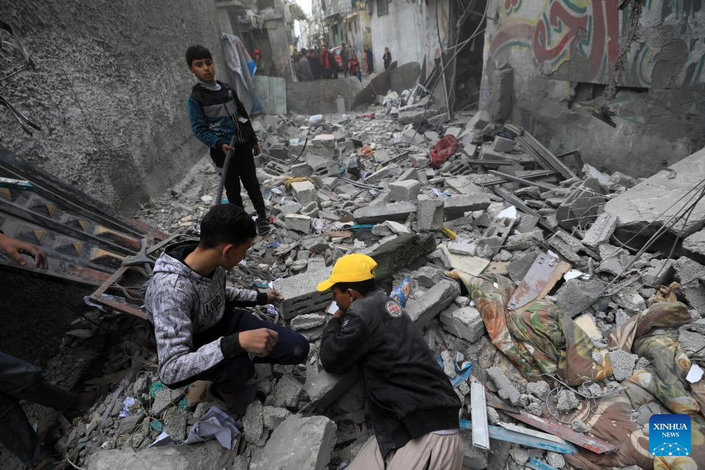 Children are seen among the rubble of a destroyed building after an Israeli airstrike in the southern Gaza Strip city of Rafah, on Jan. 17, 2024. In a statement on Wednesday, the Gaza-based health ministry said 163 Palestinians across the Gaza Strip were killed and 350 others were injured by Israeli fire in the past 24 hours. This brings the Palestinian death toll from ongoing Israeli attacks on the Strip to 24,448 and the number of injured to 61,504. (Photo by Yasser Qudih/Xinhua)