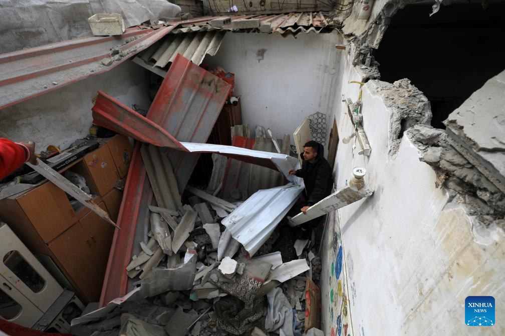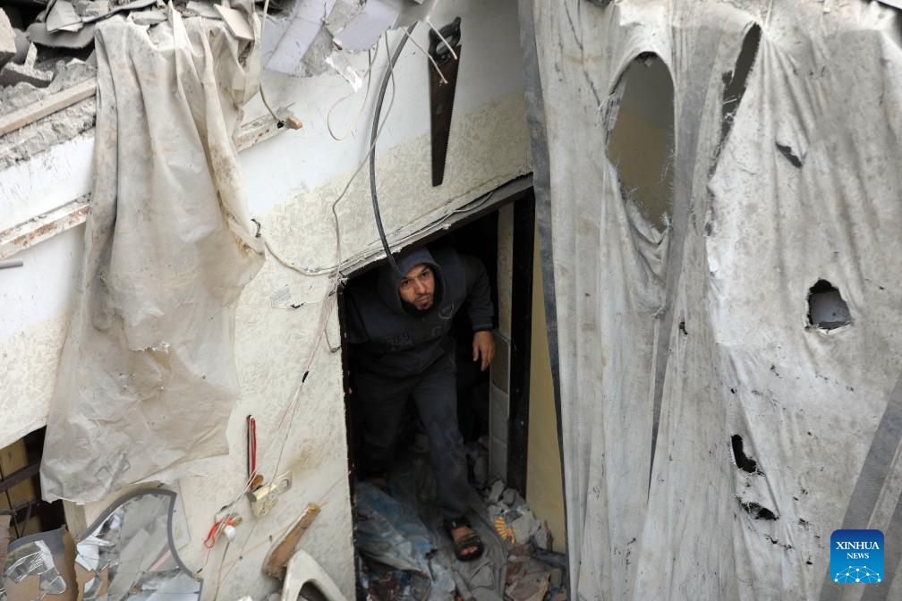 A man inspects the damage after an Israeli airstrike in the southern Gaza Strip city of Rafah, on Jan. 17, 2024. In a statement on Wednesday, the Gaza-based health ministry said 163 Palestinians across the Gaza Strip were killed and 350 others were injured by Israeli fire in the past 24 hours. This brings the Palestinian death toll from ongoing Israeli attacks on the Strip to 24,448 and the number of injured to 61,504. (Photo by Yasser Qudih/Xinhua)