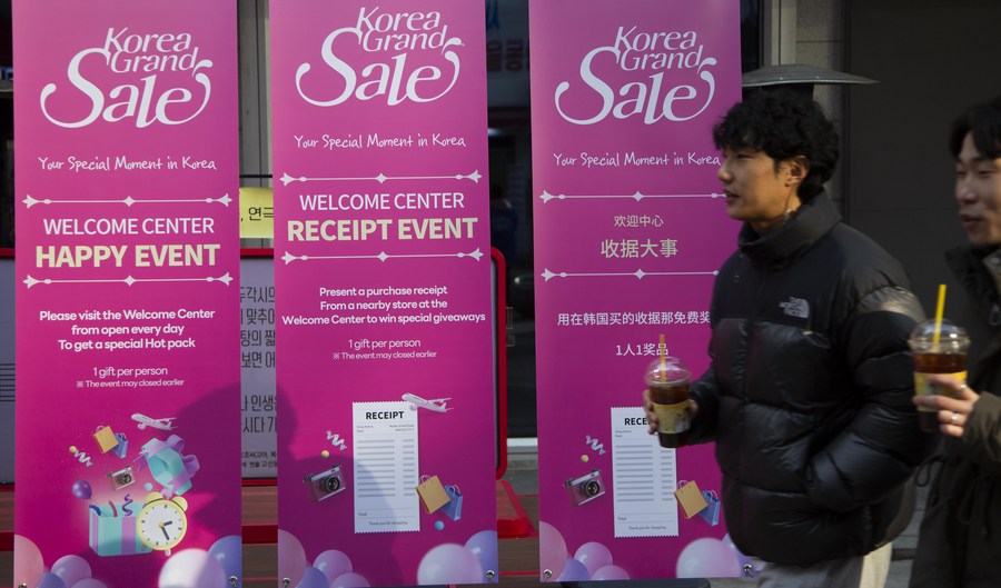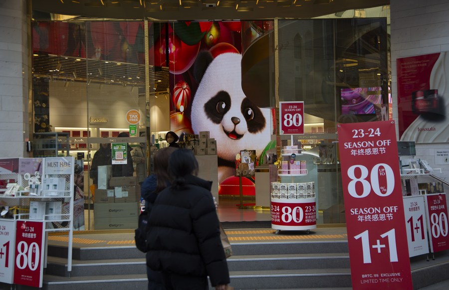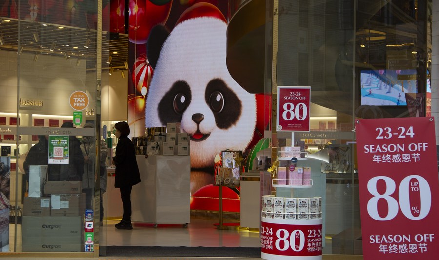 People visit a shop at the Myeongdong shopping area during a sales season in Seoul, South Korea, Jan. 16, 2024. (Photo by Paul.J/Xinhua)■