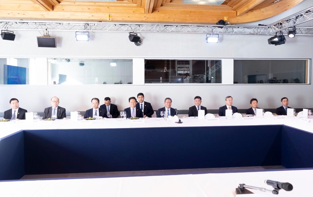 Chinese Premier Li Qiang attends a luncheon hosted by Klaus Schwab, founder and executive chairman of the World Economic Forum (WEF), and exchanges views with heads of multinational companies during the WEF Annual Meeting 2024 in Davos, Switzerland, Jan. 16, 2024. (Xinhua/Ding Haitao)
