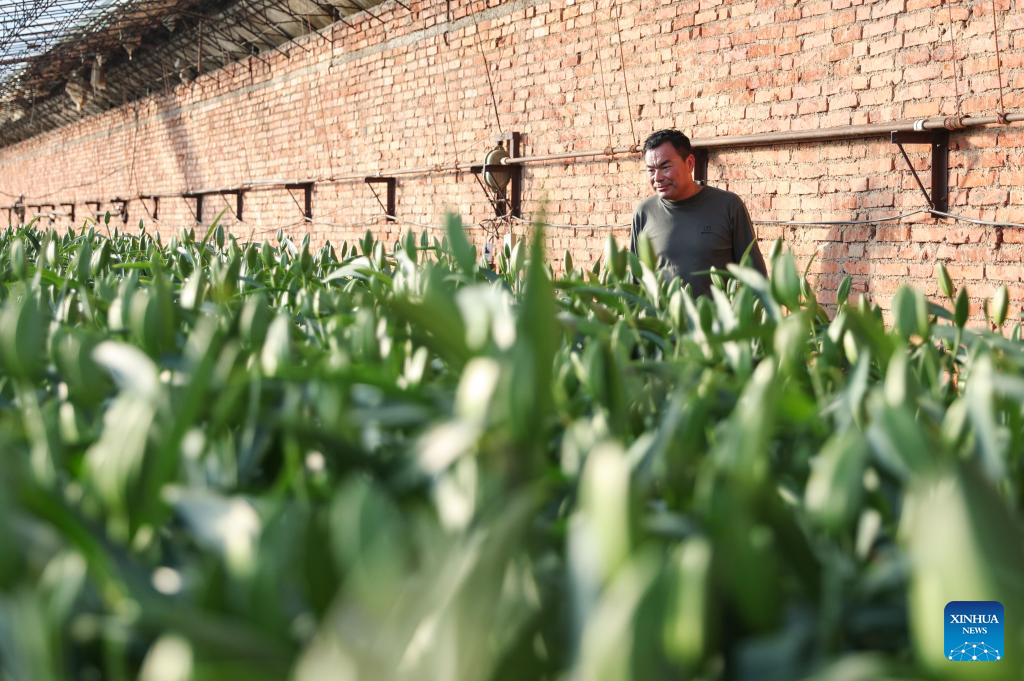 Farmer Zhang Yulu checks the growth of lilies at Dongwuguan Village in Lingyuan city, northeast China's Liaoning Province, Jan. 9, 2024. (Xinhua/Long Lei)