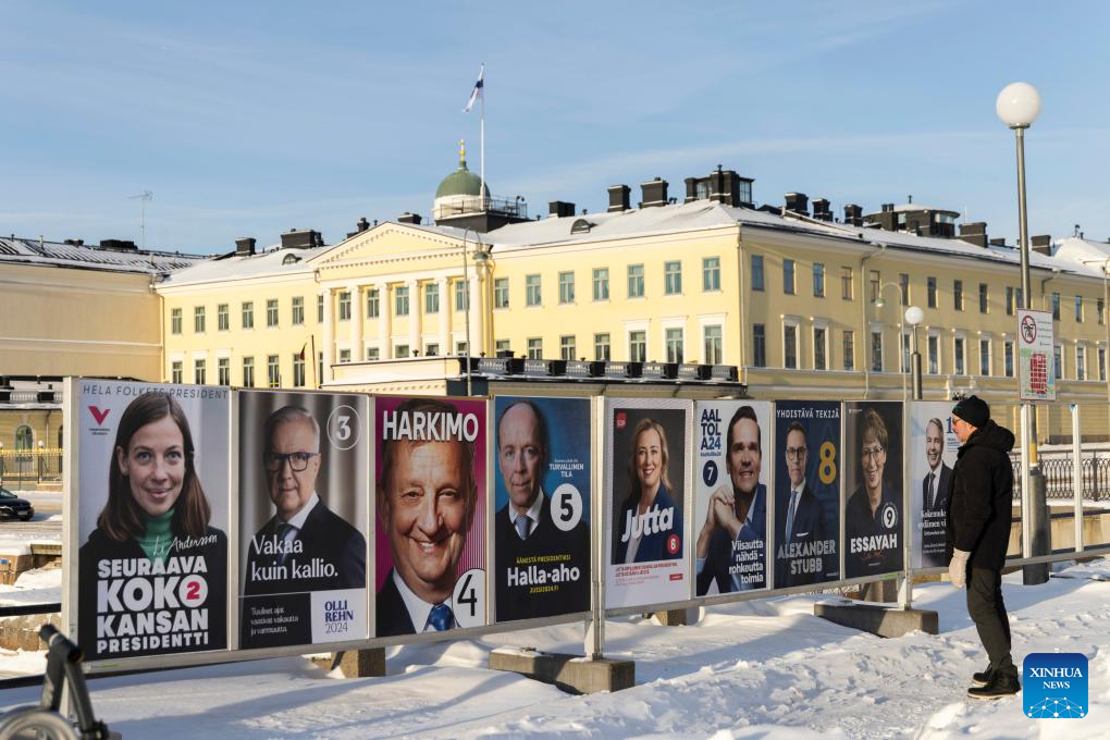 A man looks at the campaign posters for vote in the Finnish presidential elections in Helsinki, Finland, on Jan. 16, 2024. Early voting started in the Finnish presidential election on Wednesday, more than a week before the Jan. 28 election day in the first round. (Photo by Matti Matikainen/Xinhua)