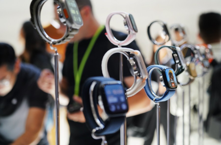 People try new Apple products after their launch in Cupertino, California, the United States, Sept. 12, 2023. (Xinhua/Wu Xiaoling)