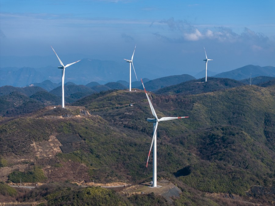 An aerial drone photo taken on Jan. 10, 2024 shows wind turbines in Liutang Township of Shizhu Tujia Autonomous County, southwest China's Chongqing. (Xinhua/Huang Wei)