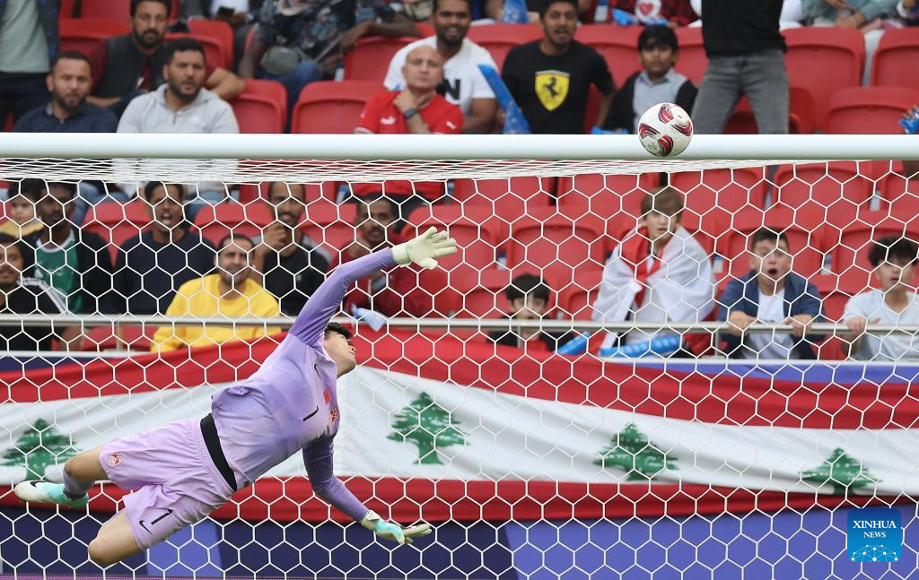 Yan Junling, goalkeeper of China, makes a save during the Group A match between China and Lebanon at AFC Asian Cup Qatar 2023 in Doha, Qatar, Jan. 17, 2024. (Xinhua/Cao Can)