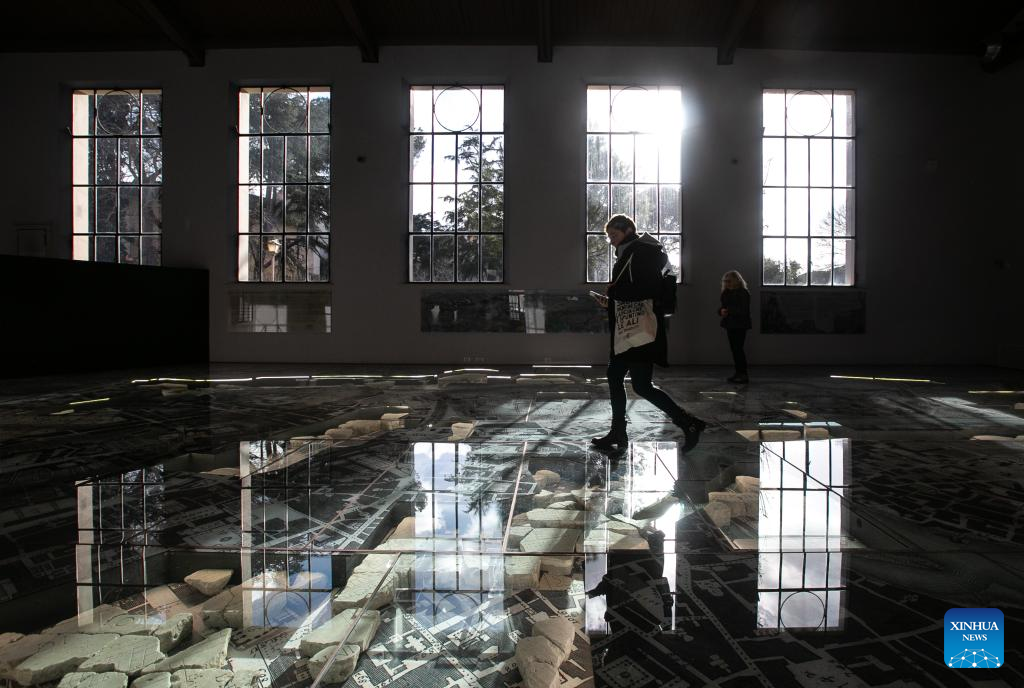 Visitors take a tour in the Museum of Forma Urbis in Rome, Italy, Jan. 16, 2024. The Museum of the Forma Urbis, enclosed within a new archaeological park, opened to the public recently. (Xinhua/Li Jing)
