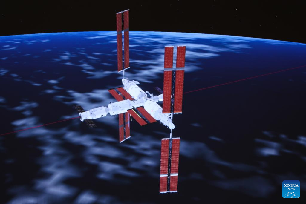 China's cargo craft Tianzhou-7 completed its status setting and docked with the orbiting Tiangong space station on Thursday, the China Manned Space Agency (CMSA) said. (Photo by Han Qiyang/Xinhua)