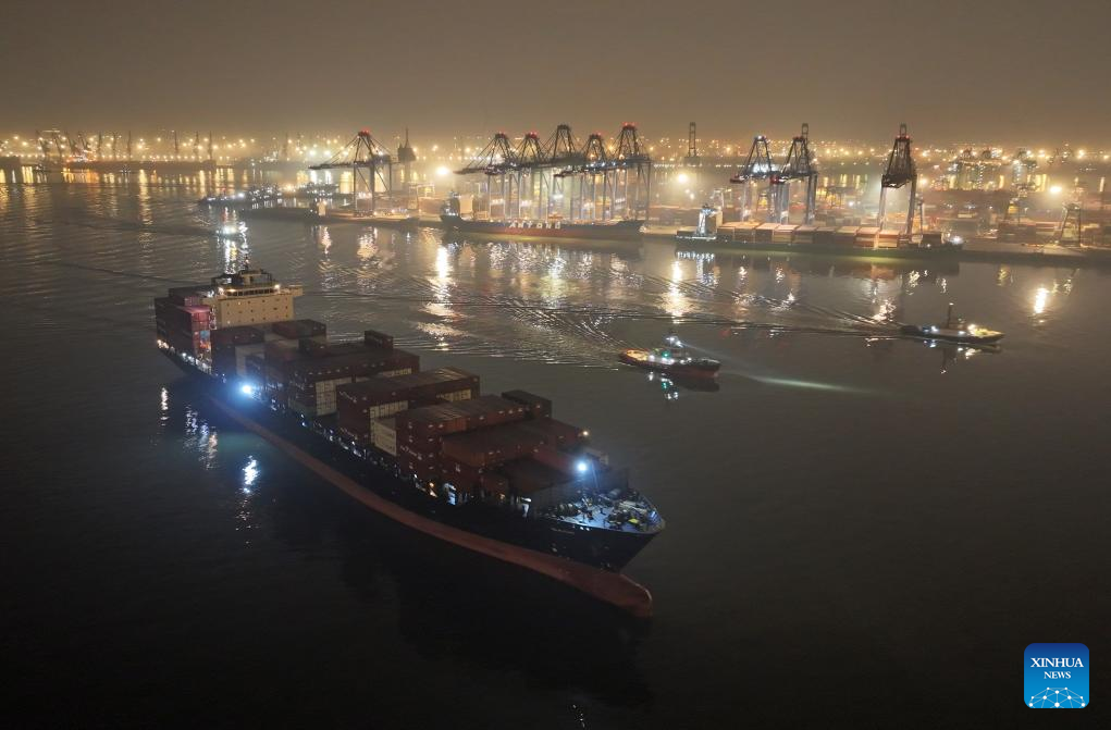 An aerial drone photo taken on Jan. 16, 2024 shows a container vessel loaded with imported cherries sailing toward a container terminal of Tianjin Port in north China's Tianjin. North China's Tianjin Port has launched a new direct shipping route to facilitate cherry imports from Chile, marking the first direct shipping service for Latin American cherries to the Beijing-Tianjin-Hebei region, said the port authorities. (Xinhua/Zhao Zishuo)