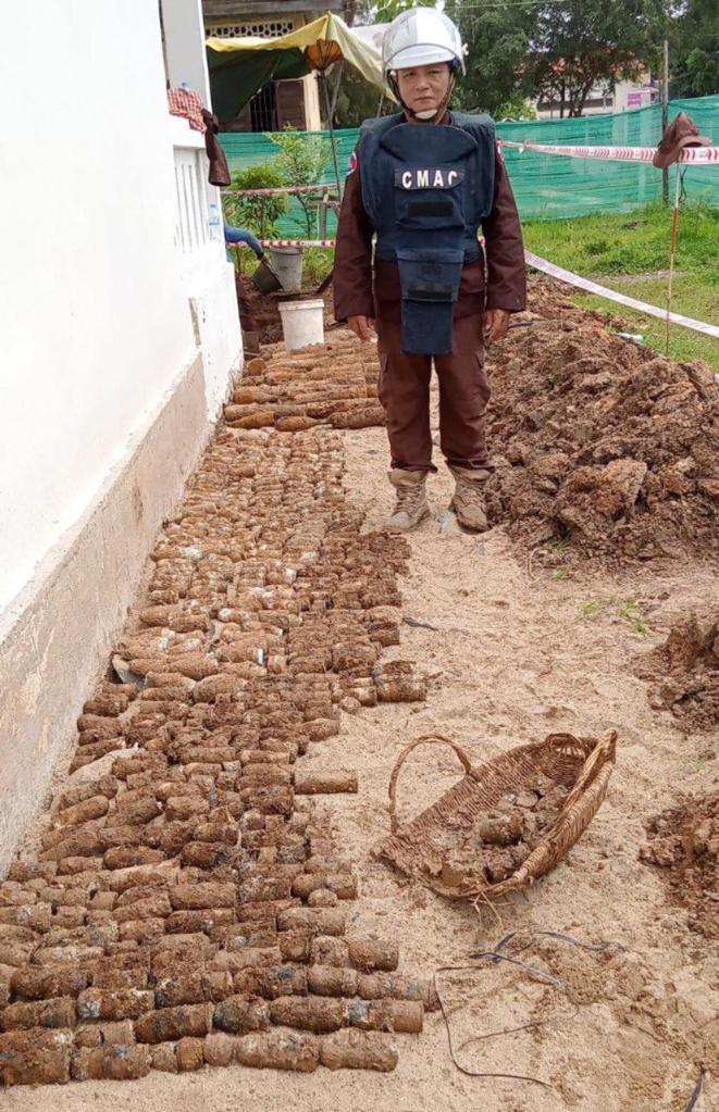 A deminer stands next to war-era unexploded ordnance unearthed from the grounds of a high school in Kratie province, Cambodia, on Aug. 13, 2023. (CMAC/Handout via Xinhua)
