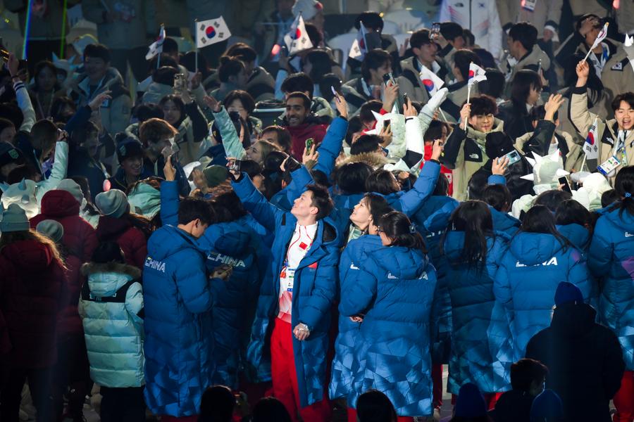 Athletes paraded into the venue in alphabetical order of their national or regional names in the Korean language, with China's national flag carried by ice hockey player Zhang Jingyue.