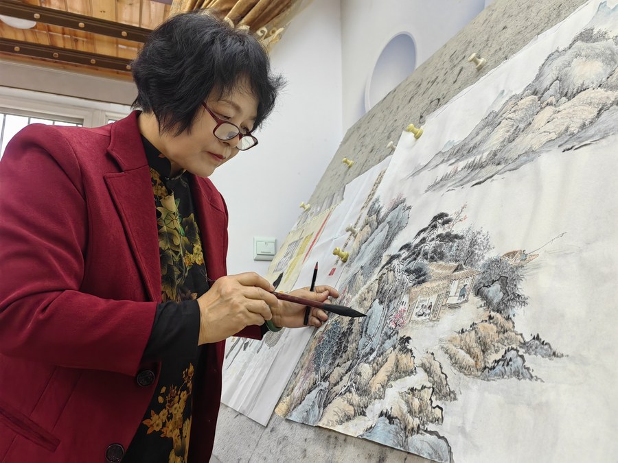 Chen Xiaoling draws a painting in Xi'an, northwest China's Shaanxi Province, Nov. 15, 2023. (Xinhua/Sun Zhenghao)
