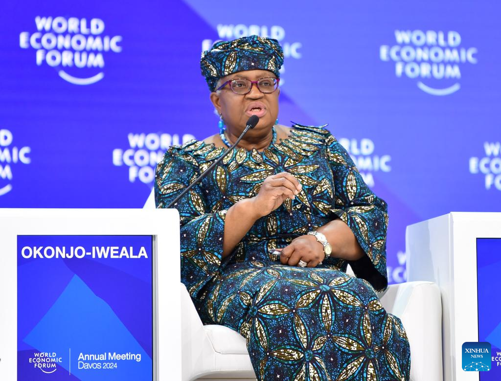 Ngozi Okonjo-Iweala, director-general of the World Trade Organization (WTO), speaks at the World Economic Forum (WEF) Annual Meeting 2024 in Davos, Switzerland, Jan. 18, 2024. Trade and investment remain essential for the continued recovery of the global economy, participants said at the 54th World Economic Forum (WEF) Annual Meeting here this week.(Xinhua/Lian Yi)