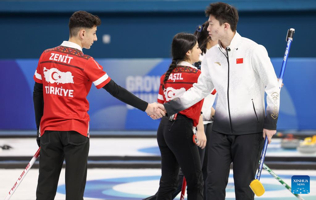 Muhammed Taha Zenit (L) of Türkiye and Li Zetai of China shake hands after the curling mixed team round robin session 1 match between Türkiye and China at the Gangwon 2024 Winter Youth Olympic Games at Gangneung Curling Centre, South Korea, Jan. 20, 2024. (Xinhua/Hu Huhu)