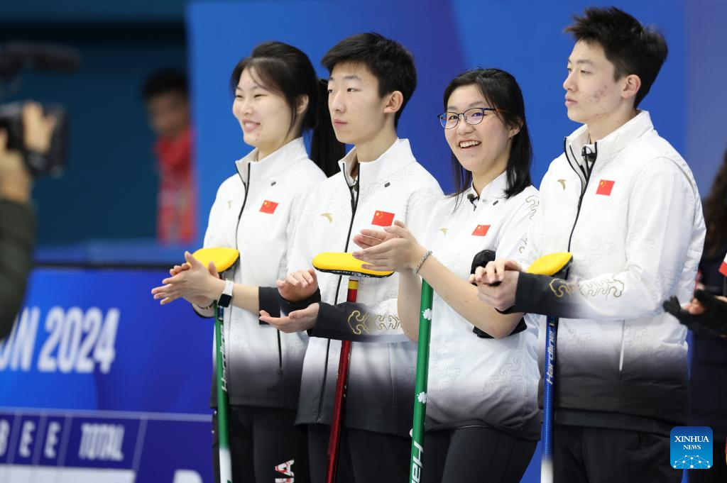 Team China compete during the curling mixed team round robin session 1 match between Türkiye and China at the Gangwon 2024 Winter Youth Olympic Games at Gangneung Curling Centre, South Korea, Jan. 20, 2024. (Xinhua/Hu Huhu)