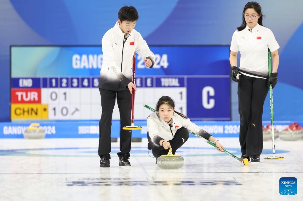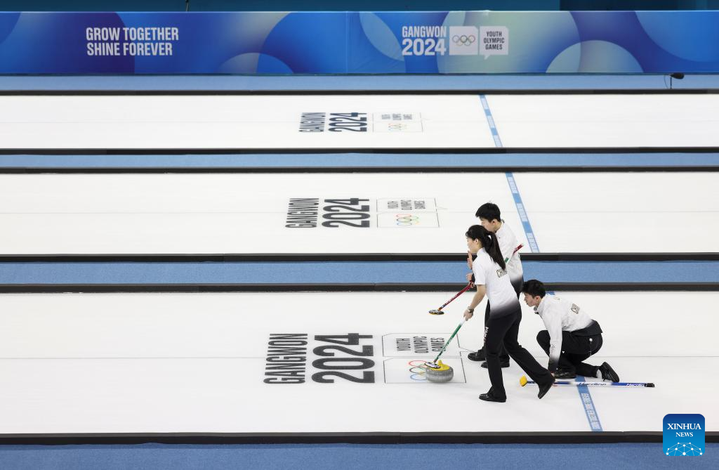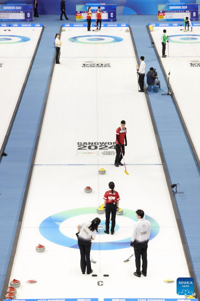 Athletes compete during the curling mixed team round robin session 1 match between Türkiye and China at the Gangwon 2024 Winter Youth Olympic Games at Gangneung Curling Centre, South Korea, Jan. 20, 2024. (Xinhua/Hu Huhu)