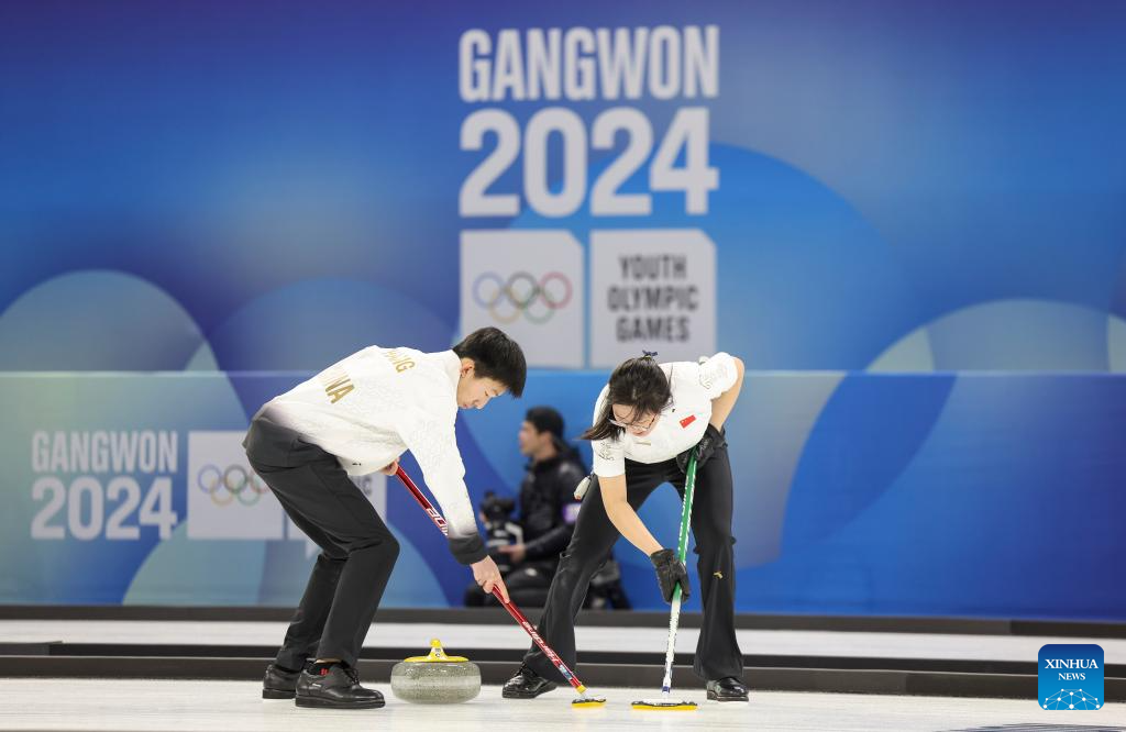 Zhang Minghang (L) and Chen Zaoxue of China compete during the curling mixed team round robin session 1 match between Türkiye and China at the Gangwon 2024 Winter Youth Olympic Games at Gangneung Curling Centre, South Korea, Jan. 20, 2024. (Xinhua/Hu Huhu)