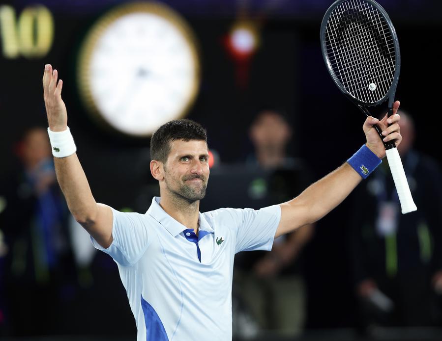 MELBOURNE, Australia, Jan. 21 (Xinhua) -- Men's top seed Novak Djokovic was in vintage form on Sunday as he swept aside Adrian Mannarino of France to storm into the quarterfinals of the Australian Open, while Aryna Sabalenka continued her effortless march towards a title defence.