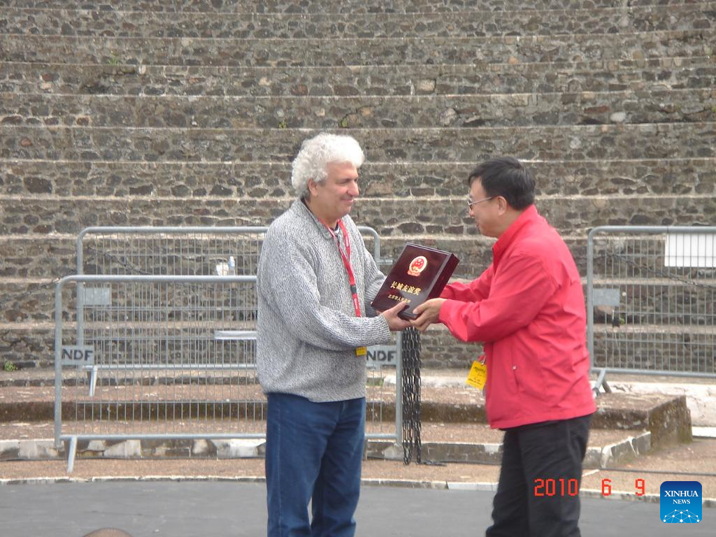 This file photo taken on June 9, 2010 shows French theater director Patrick Sommier receiving Beijing Great Wall Friendship Award from Beijing municipal government. (Xinhua)