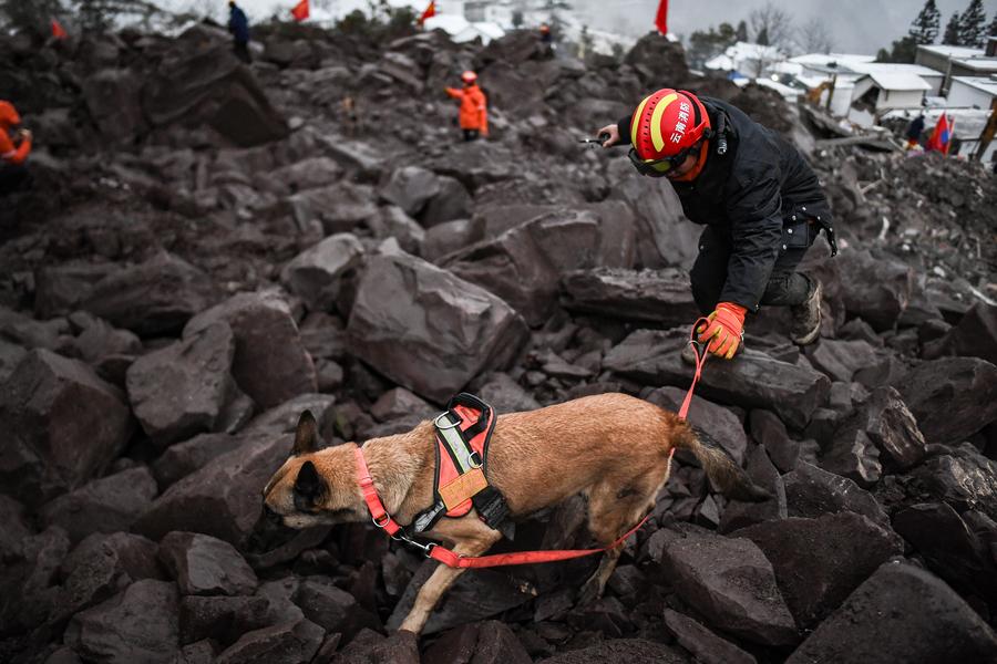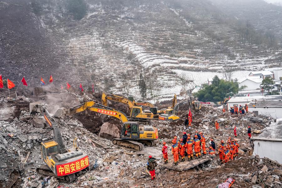 A rescuer carries out rescue operation with a rescue dog at the site of a landslide in Liangshui Village, Tangfang Town in the city of Zhaotong, southwest China's Yunnan Province, Jan. 23, 2024. (Xinhua/Jiang Wenyao)Rescuers work at the site of a landslide in Liangshui Village, Tangfang Town in the city of Zhaotong, southwest China's Yunnan Province, Jan. 23, 2024. (Xinhua/Jiang Wenyao)Rescuers work at the site of a landslide in Liangshui Village, Tangfang Town in the city of Zhaotong, southwest China's Yunnan Province, Jan. 23, 2024. (Xinhua/Jiang Wenyao)An aerial drone photo shows rescuers working at the site of a landslide in Liangshui Village, Tangfang Town in the city of Zhaotong, southwest China's Yunnan Province, Jan. 23, 2024. (Xinhua/Hu Chao)Rescuers work at the site of a landslide in Liangshui Village, Tangfang Town in the city of Zhaotong, southwest China's Yunnan Province, Jan. 23, 2024. (Xinhua/Hu Chao)A rescuer carries out rescue operation with a rescue dog at the site of a landslide in Liangshui Village, Tangfang Town in the city of Zhaotong, southwest China's Yunnan Province, Jan. 23, 2024. (Xinhua/Jiang Wenyao)A rescuer carries out rescue operation with a rescue dog at the site of a landslide in Liangshui Village, Tangfang Town in the city of Zhaotong, southwest China's Yunnan Province, Jan. 23, 2024. (Xinhua/Jiang Wenyao)Rescuers carry out rescue operations in Liangshui Village, Tangfang Town in the city of Zhaotong, southwest China's Yunnan Province, Jan. 23, 2024. (Xinhua/Hu Chao)Rescuers carry out rescue operations in Liangshui Village, Tangfang Town in the city of Zhaotong, southwest China's Yunnan Province, Jan. 23, 2024. (Xinhua/Hu Chao)■