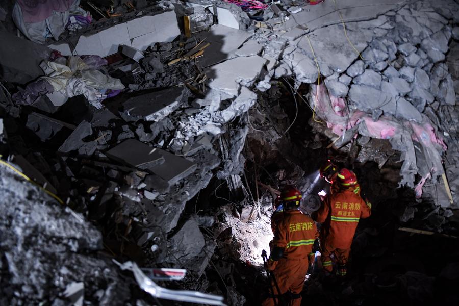 Rescuers carry out rescue operations in Liangshui Village, Tangfang Town in the city of Zhaotong, southwest China's Yunnan Province, Jan. 23, 2024. (Xinhua/Hu Chao)