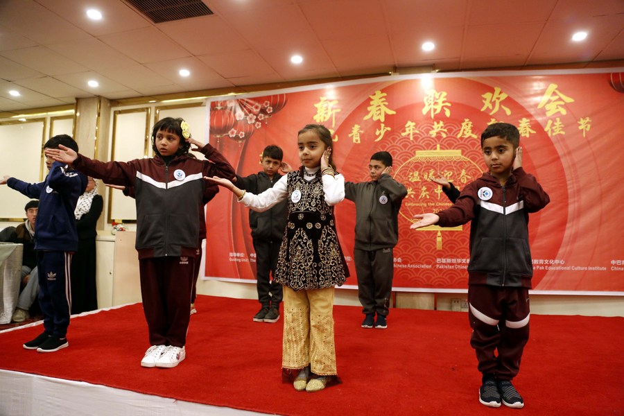 Pakistani children dance at a Chinese Lunar New Year gala in Islamabad, capital of Pakistan, Jan. 21, 2024. (Xinhua/Ahmad Kamal)