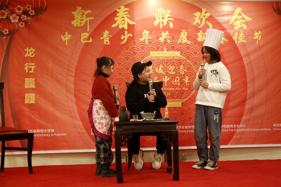 Chinese children perform a sitcom during a Chinese Lunar New Year gala in Islamabad, capital of Pakistan, Jan. 21, 2024. (Xinhua/Ahmad Kamal)