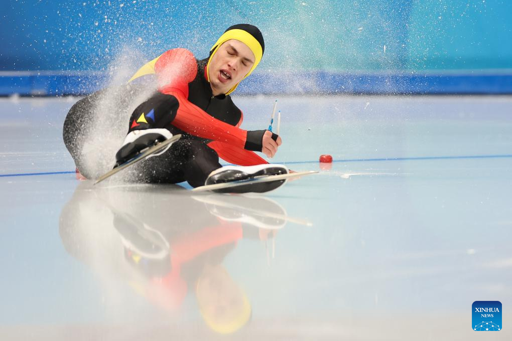 Vlad Popa of Romania falls down after crossing the finish line during the men's 1500m Final of speed skating event at the Gangwon 2024 Winter Youth Olympic Games in Gangneung, South Korea, Jan. 23, 2024. (Xinhua/Xu Yanan)
