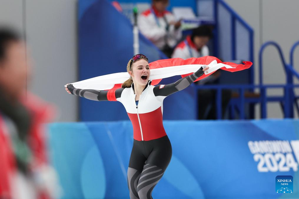 Hanna Mazur of Poland celebrates after the women's 1500m Final of speed skating event at the Gangwon 2024 Winter Youth Olympic Games in Gangneung, South Korea, Jan. 23, 2024. (Xinhua/Xu Yanan)