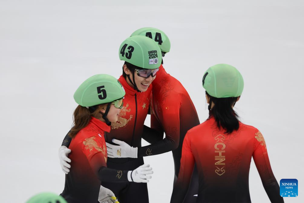 Zhang Xinzhe (2nd L) and Li Jinzi (3rd L) of team China compete during the mixed team relay final A of short track speed skating event at the Gangwon 2024 Winter Youth Olympic Games in Gangneung, South Korea, Jan. 24, 2024. (Xinhua/Yao Qilin)